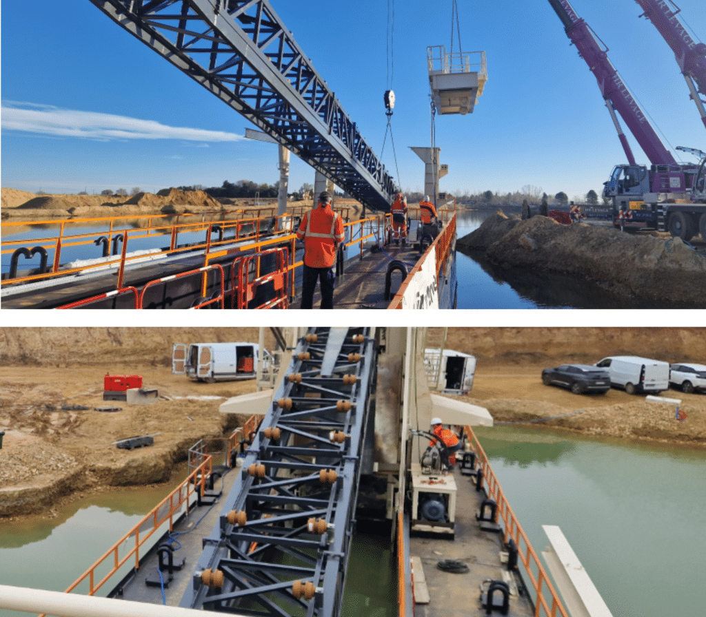 C’est un projet ambitieuxréunissant toutes les filiales de notre groupe ! La partie Mobile Construction avec le remplacement des chaînes BERCO ainsi que des godets sur mesure, la partie Mineral avec les convoyeurs et cribles et la partie Industrie avec la protection du fleuve avec des barrages flottants ainsi que des pompes.